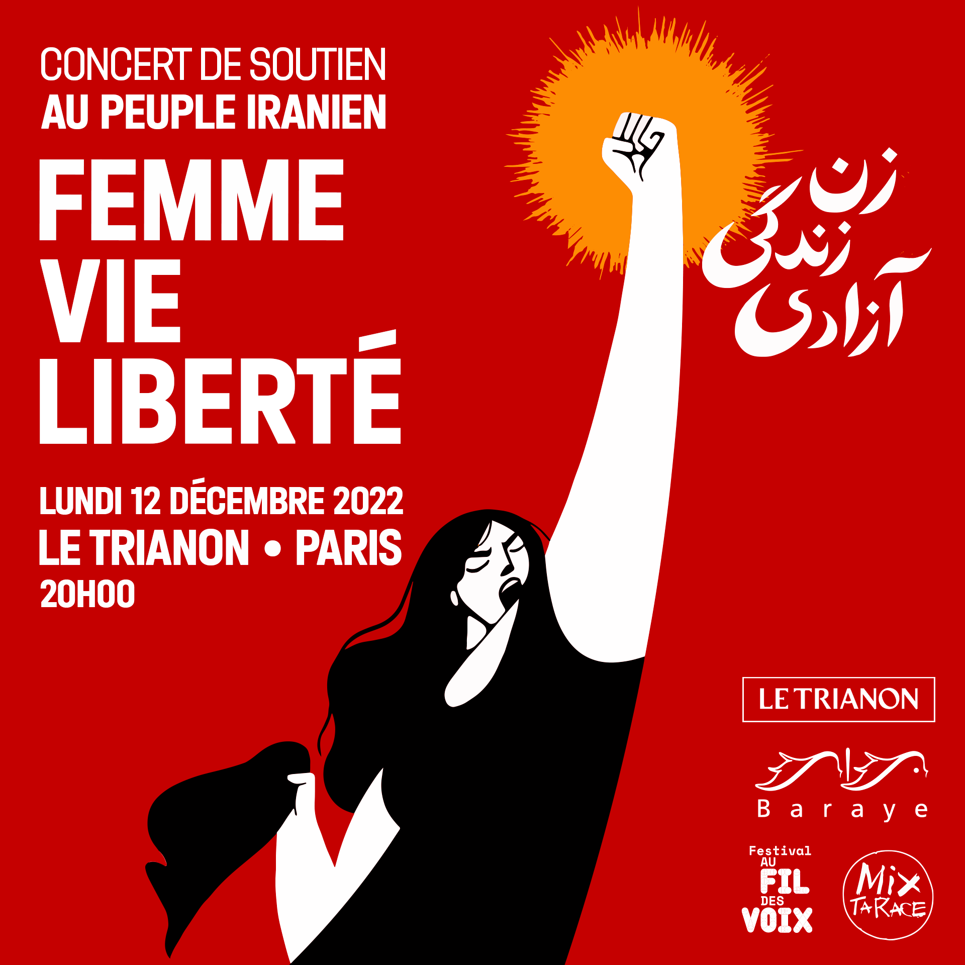 Le collectif Barâyé est spontanément né début octobre d'un désir commun : relayer la voix des Iraniennes et Iraniens dans leur combat pour la liberté. Il organise des événements culturels afin de sensibiliser et informer l'opinion publique française et rassembler les soutiens pour la cause iranienne. De nombreuses personnalités se retrouveront au Trianon pour un grand concert en soutien au peuple iranien : Roya Arab, Arthur H, Jane Birkin, Keyvan Chemirani, Imany, Mina Kavani, Mamani Keita, Souad Massi, Yaël Naïm, Aïda Nosrat, Barbara Pravi, Mashal Arman & The Kaboul Orchestra, ou encore Arat Kilo.